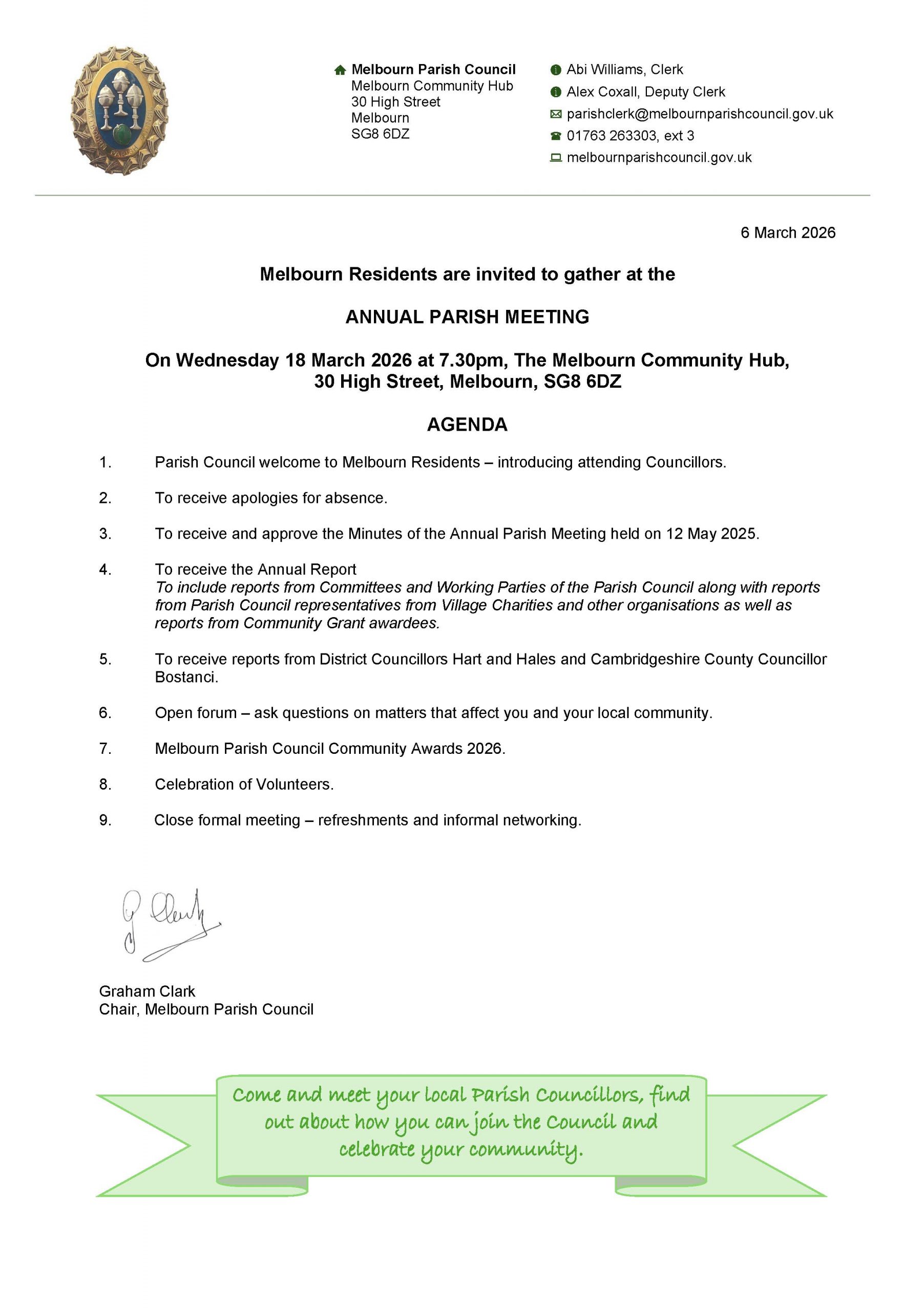 The Annual Parish Meeting will be held at Melbourn Community Hub at 7.30pm on Wednesday 18 March 2026.